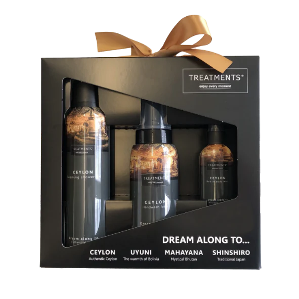 Šioje dovanų dėžutėje rasite kreminį putojantį dušo žele, kuris nuostabiai suteiks prabangos pojūtį ant odos, švelnias rankų plovimo putas ir gaivinantį kūno purškiklį, kuris leis vos keliais papurškimais apgaubti save ir aplinką maloniu Ceilono kvapu. Atraskite, kaip taukmedžio riešutų, sandalmedžio ir pačiulių kvapas, derinamas su vaisių žiedais ir jazminais, perteikia šiltą senovės Ceilono atmosferą.